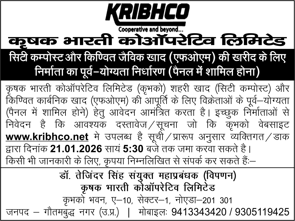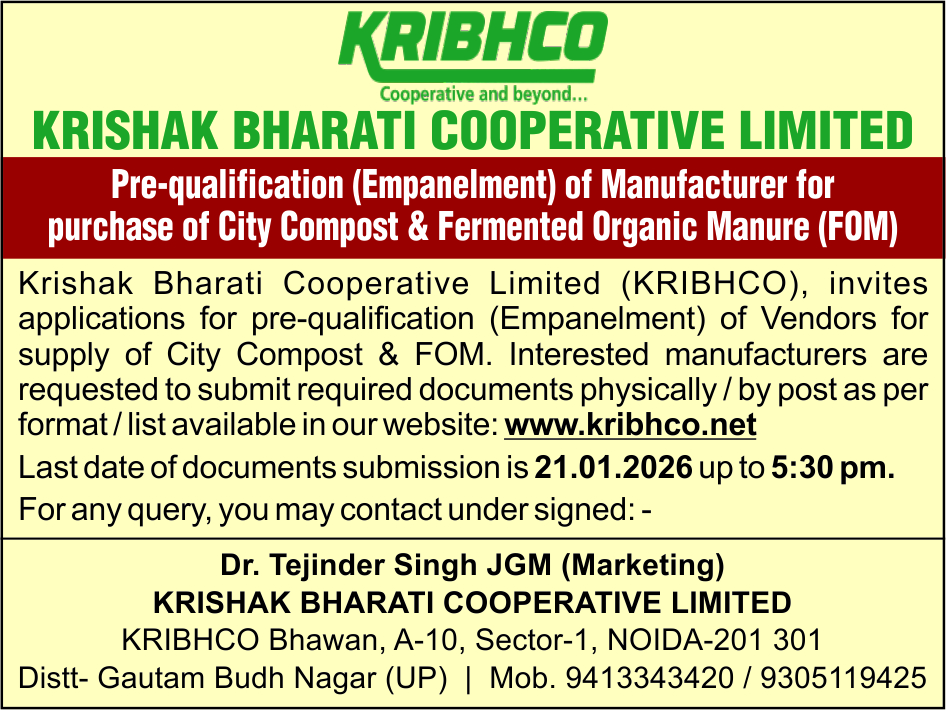 | 1. | Pre-Qualification(Empanelment) of Manufacturer for purchase of City Compost & Fermented Organic Manure(FOM) |