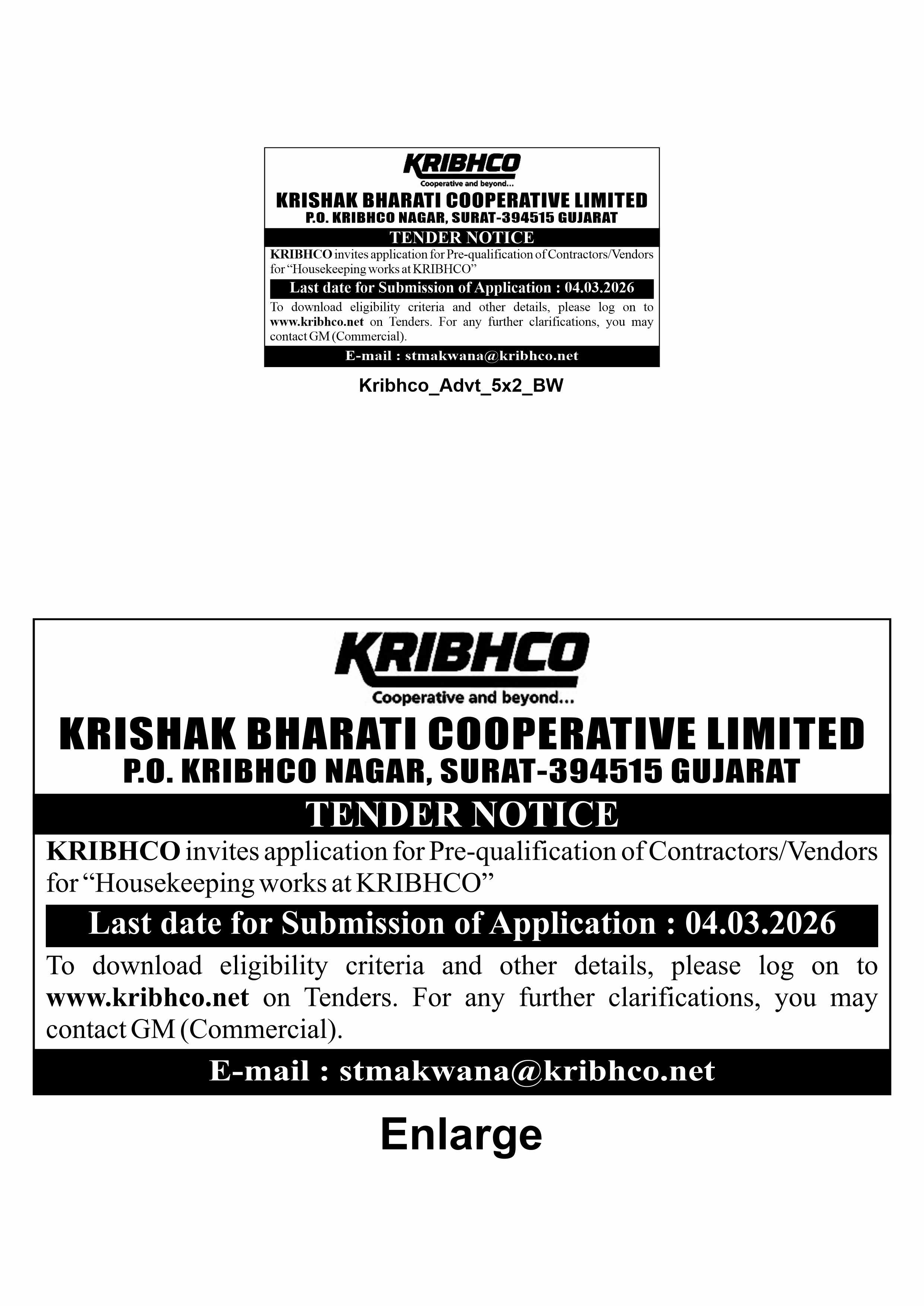 | 3. | Prequalification of Contractors/Vendors for "Housekeeping works at KRIBHCO" |