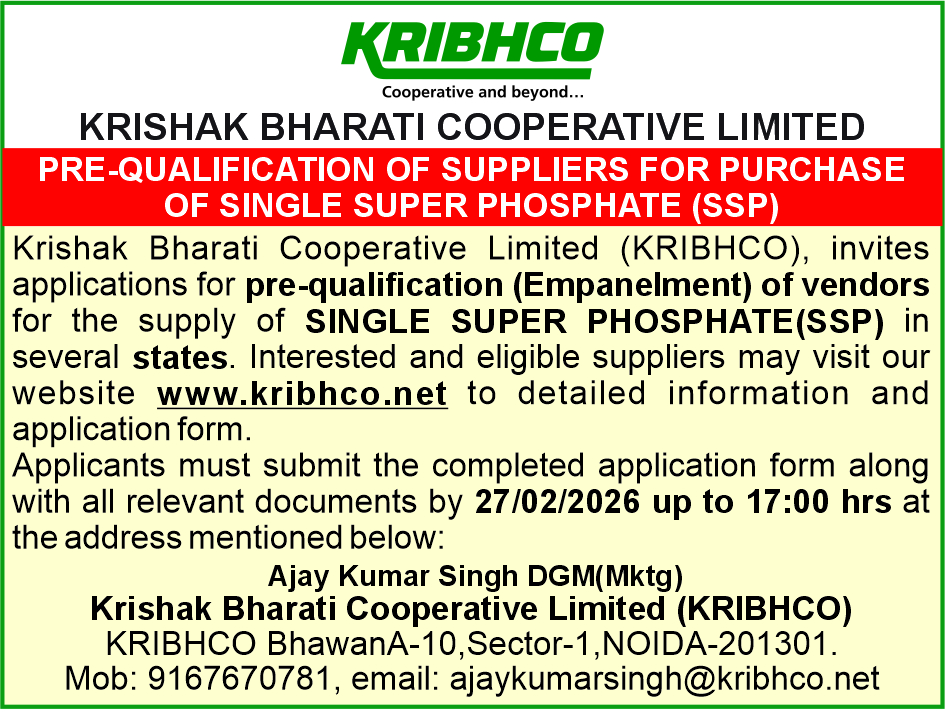| 2. | Prequalification Empanelment for Single Super Phosphate (SSP) All the required documents must be physically submitted to the address provided in the advertisement |