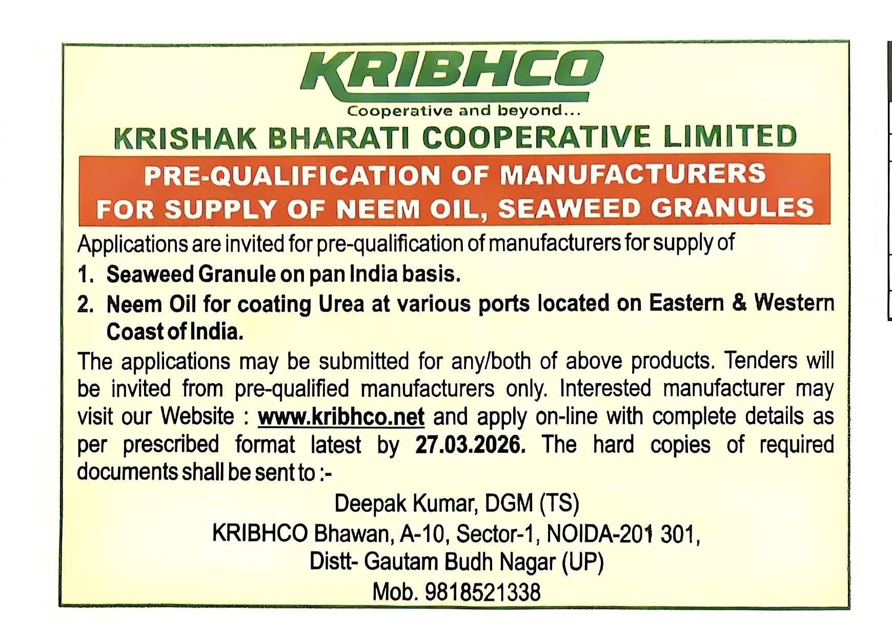 | 1. | Prequalification of manufacturer for supply of Seaweed Granule FCO Grade (Bio Stimulants) on pan India basis Please complete the registration process by entering your email ID and creating a password. After registration, use the same email ID and password to log in and upload the documents. |
