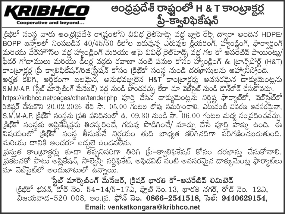 | 1. | Pre-Qualification of Handling & Transport (H&T) contractors in Andhra Pradesh State Please complete the registration process by entering your email ID and creating a password. After registration, use the same email ID and password to log in and upload the documents. |